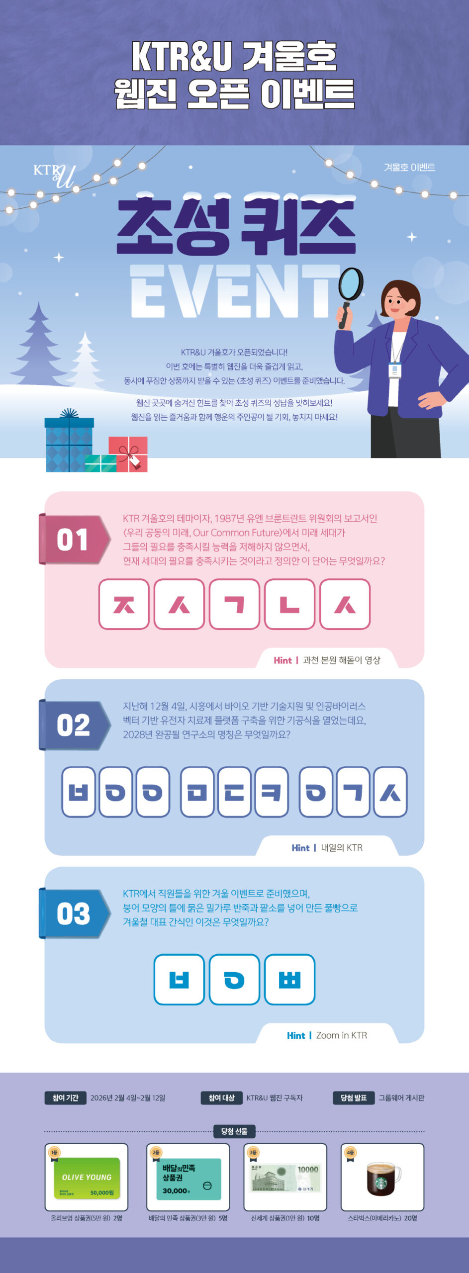 초성퀴즈를 풀고, 정답과 함께 이름, 연락처를 적어 sunnypark@ktr.or.kr로 보내주세요.
