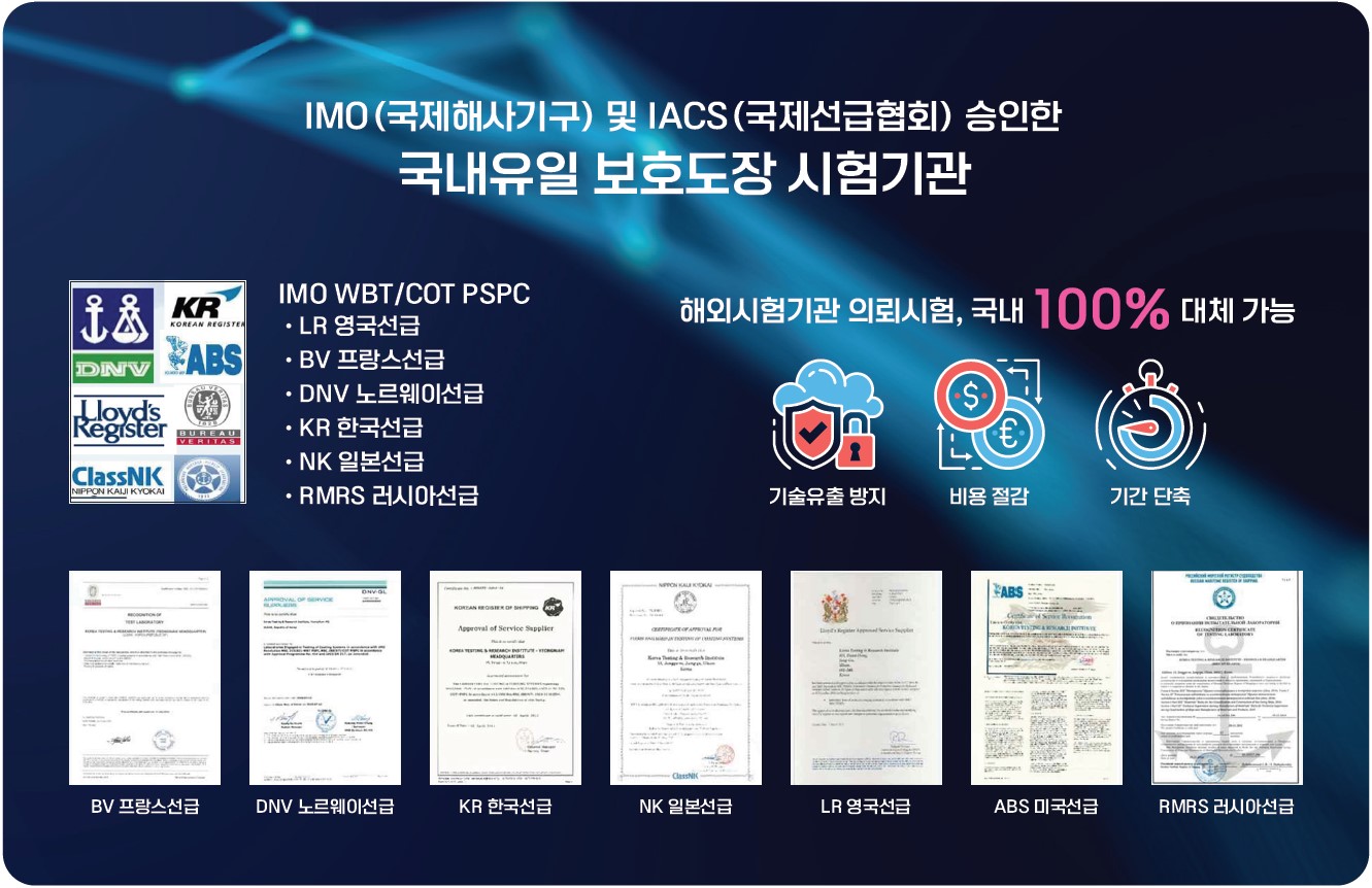 GTT Mark Ⅲ, 극저온 선급 인증을 위한 국내 유일의 보호도장 선급인증 평가를 수행하며, IMO, IACS 보호도장 지정시험기관으로서 세계 6대 선급의 지정을 받았습니다. 또한, 해양플랜트 구조물의 극한 환경 도장 코팅 성능 평가, 자동차 내외장 도장 부품 시험 등 다양하고 극한 환경에서 사용되는 소재 및 용접부의 국내 최고의 코팅 성능을 평가합니다.