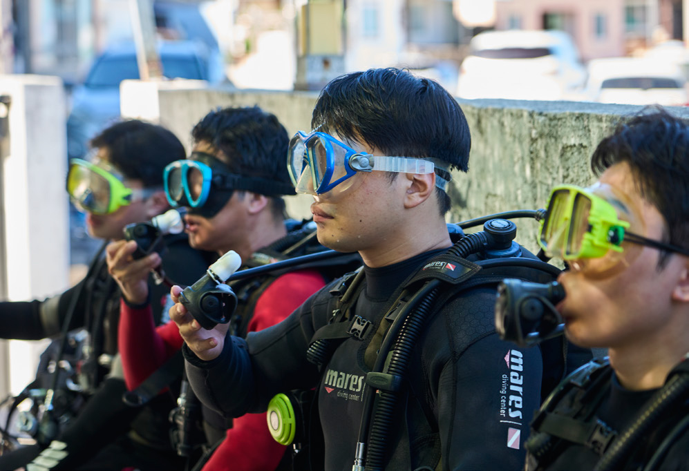 이후 착용한 마스크 안에 직접 물을 넣은 뒤 물을 빼는 연습을 진행했고, 물속에서 서로 소통할 수 있는 간단한 수신호를 배운 뒤 바다로 향했다.