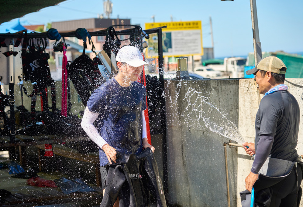 본격적인 체험에 앞서 교육을 받기 위해 테이블에 앉은 직원들은 강사의 설명을 들으며 유의해야 할 점들을 교육받았다. 마스크에 물이 찼을 때 어떠한 방법으로 물을 제거하고 시야를 확보해야 하는지, 호흡기를 착용했을 때 어떻게 호흡해야 하는지, 그리고 호흡기가 입에서 빠졌을 때 어떻게 다시 착용해야 하는지 등 자칫 위험해질 수 있는 상황에 대비하기 위한 교육에 집중하고 또 집중했다. 기본적인 실습을 마무리하고 바다로 나가기 전 슈트를 착용했다.
