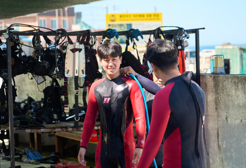 “한 번에 맞춰버리시니까 당황스럽네요. 하하. 네 맞습니다. 산소탱크가 18kg, 웨이트가 10kg, 그리고 나머지 장비들을 합치면 30kg 정도 됩니다. 이렇게 무거우니 물속에 쑤욱 들어갈 수 있을 것 같죠? 안 그래요. 구명조끼를 착용하고 있어서 부력 때문에 물속에 못 내려가요. 그러니까 ‘물속 깊이 빠지면 어떡하지?’라는 걱정은 안 하셔도 됩니다. 그저 긴장을 풀고 호흡을 편안하게 하는 데만 집중하세요. 그러면 저희가 입수할 수 있도록 도와드리겠습니다. 멘탈 관리만 잘 하세요. 심리적으로 불안해하면 호흡이 불안해지니까요. 자, 그럼 지금부터 슈트를 착용하러 이동하실 게요.” 강사는 이렇게 말하며 준비한 슈트를 직원들에게 착용시켜 주었다.