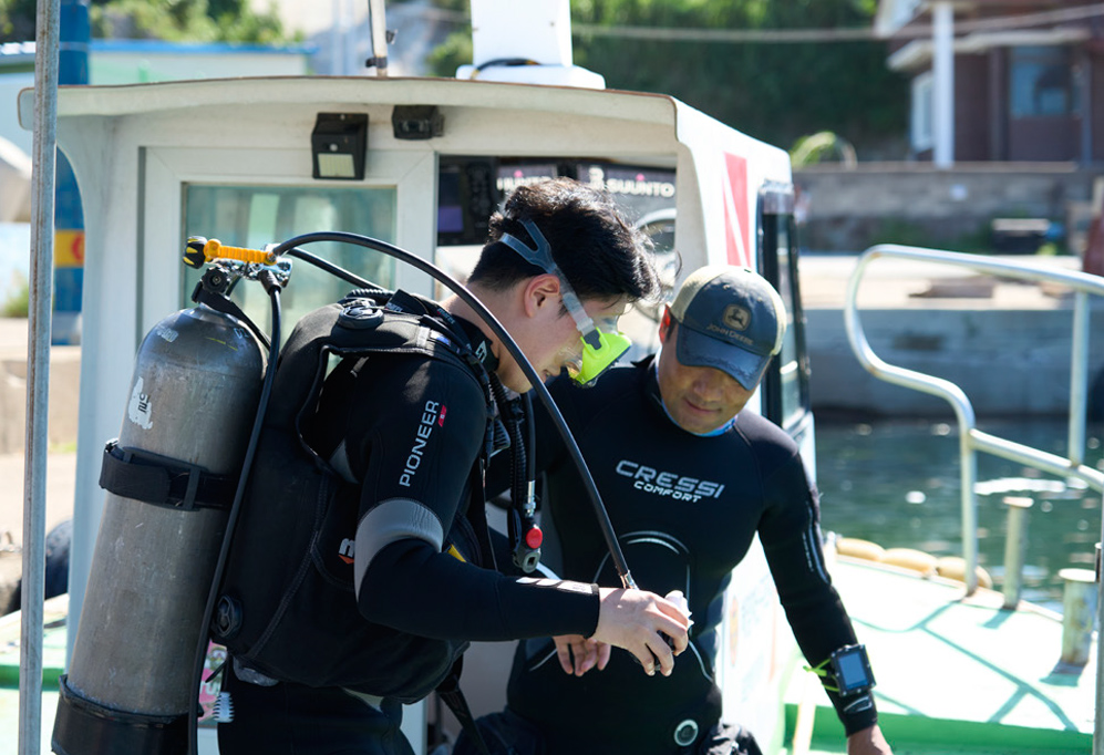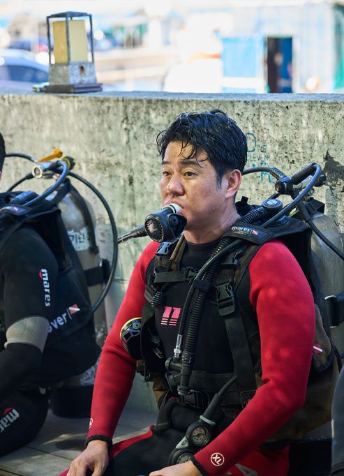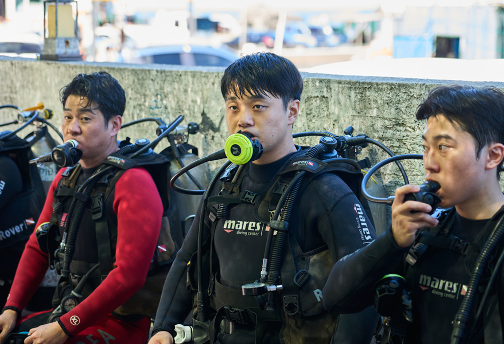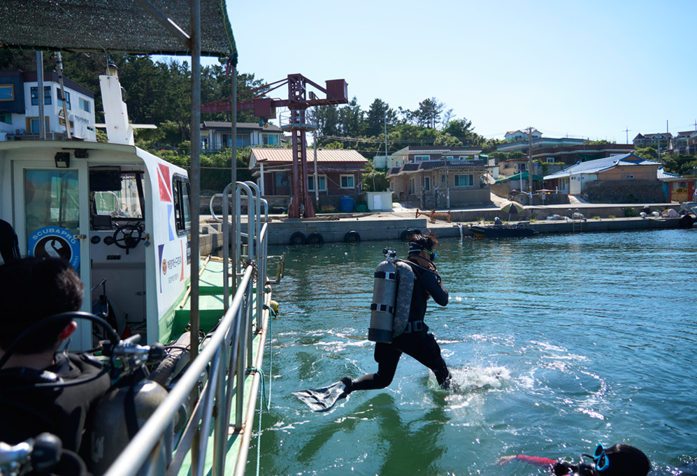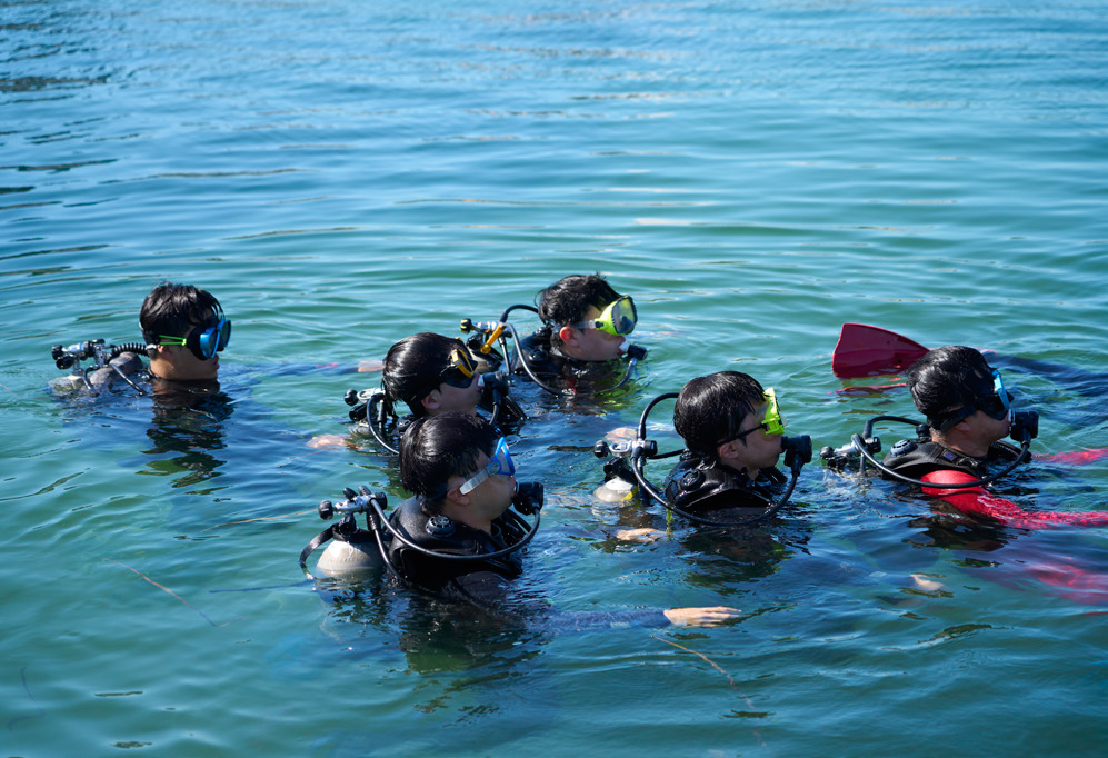 비장한 표정으로 배 위에 올라탄 직원들은 일렁이는 물살을 헤치고 스쿠버다이빙 체험 장소로 향했다. 입수 전 마지막으로 마스크에 김 서림 방지 액체를 바른 뒤 한 명씩 바다로 뛰어든 직원들은 바다 위에 둥둥 뜬 채 호흡법을 다시 한번 연습했다. 박성철 선임연구원은 이때를 회상하며 “직접 바다에서 호흡하니 처음에는 가슴도 답답하고 너무 어려웠었는데, 차차 안정을 찾아나갔다.”라고 말하기도 했다.