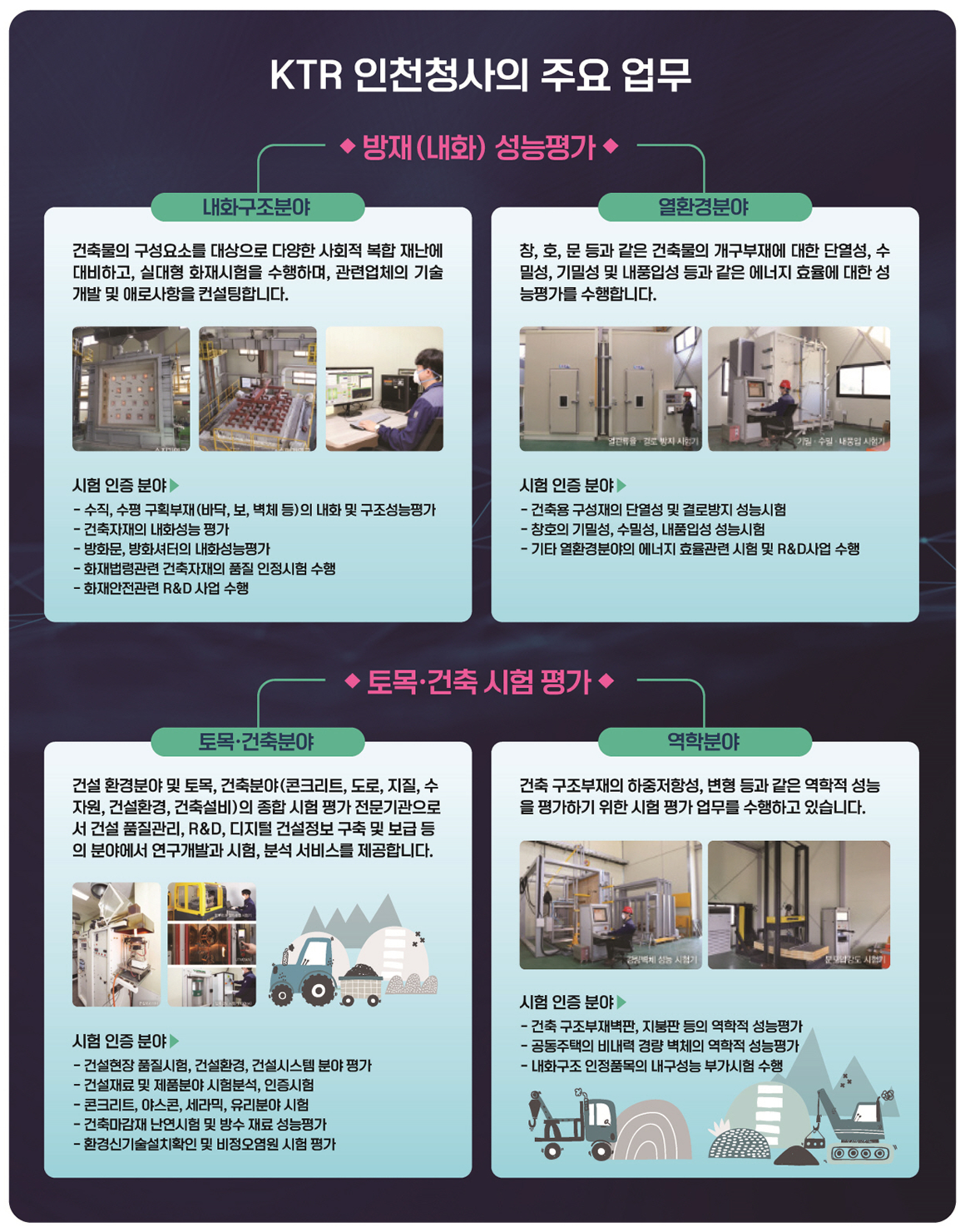 KTR은 산업 전 분야에 걸쳐 종합 시험, 인증, 기술 컨설팅을 수행하며 대한민국을 대표하는 시험인증기관으로 자리매김하고 있습니다. 과천 본원을 중심으로 인천, 용인, 울산, 화순 등 전국 각지에 전문 청사를 운영하며, 권역별 특화된 서비스를 제공하고 있을 뿐만 아니라 해외에서도 각국 인증 및 탄소중립 사업을 직접 수행하며 글로벌 역량을 강화하고 있습니다. 가을 호에서는 특히 건설 분야의 안전과 품질을 책임지는 인천청사의 중점 업무와 주요 성과에 대해 깊이 있게 조명하고자 합니다.