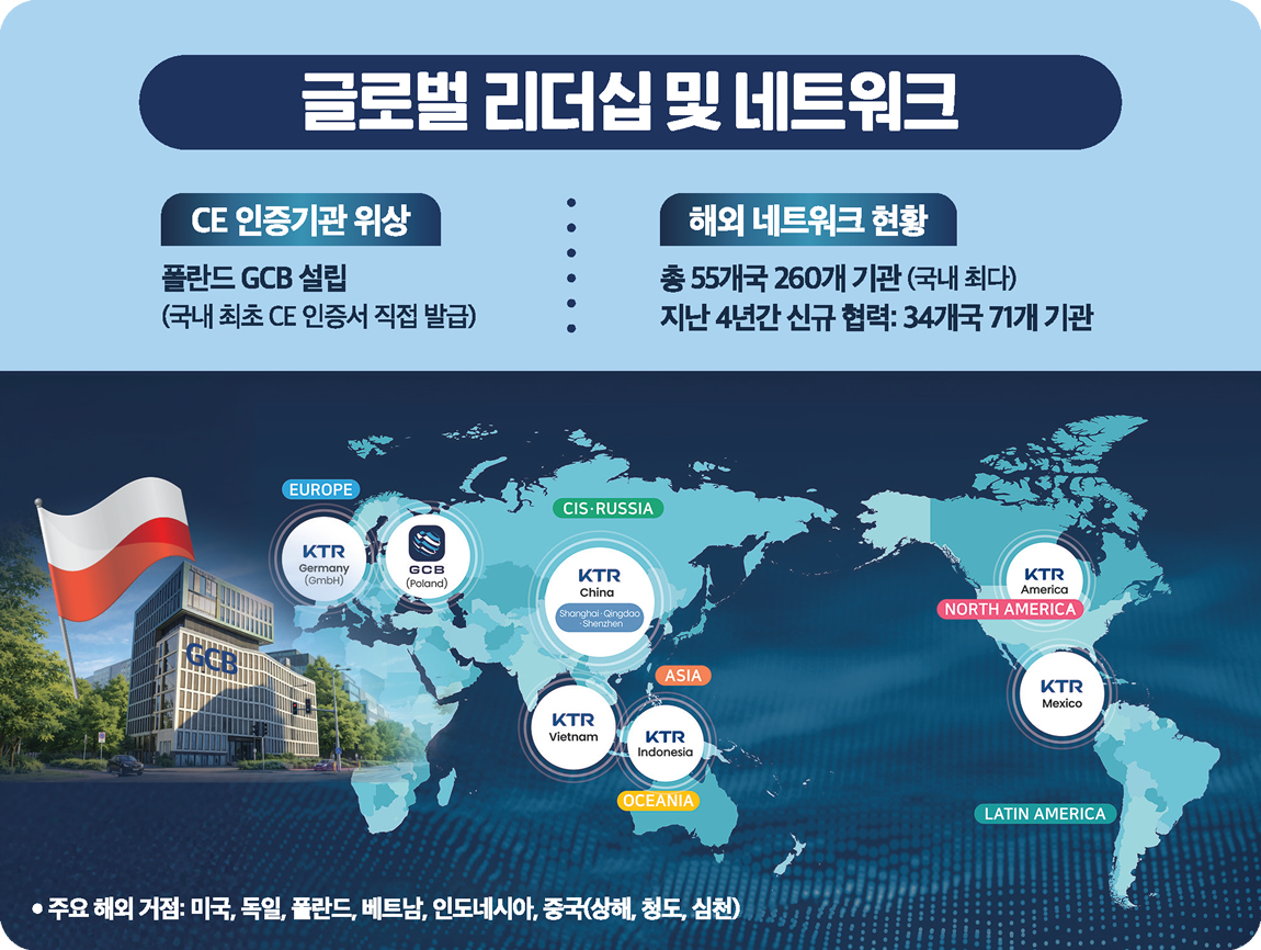 KTR은 글로벌 위상 확보에 박차를 가하고 있다. 특히 2023년 폴란드에 설립한 GCB(Global Conformity Bureau)를 통해 지난 10월 첫 CE 인증서를 직접 발급하며 유럽 CE 인증 권한을 가진 공인 기관으로서의 역량을 입증했다. 현재 기계류 CE 인증기관 자격을 갖춘 GCB는 향후 의료기기, 품질경영, 사이버보안, 나아가 준비 중인 AI 인증 제도에 이르기까지 인증 분야를 확대 지정해 나갈 계획이다.