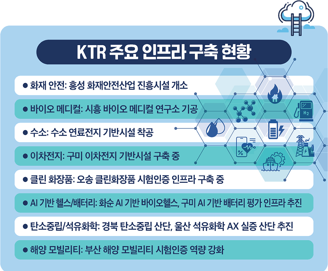 KTR은 지난 4년간 미래 신산업 시험인증 인프라 확충에 적극 투자해 왔다. 지난 11월 홍성에 화재안전산업 진흥시설을 개소하고, 12월에는 시흥에 바이오 메디컬 연구소 기공식을 가졌다. 또한, 지난 9월 수소 연료전지 기반 시설 착공에 들어갔으며, 2024년부터는 구미 이차전지 기반 시설과 오송 클린화장품 시험인증 인프라를 구축하는 등 핵심 산업에 대한 지원을 아끼지 않고 있다.이 외에도 AI 기반 바이오헬스(화순), AI 기반 배터리 평가(구미), 탄소중립 산단 구축(경북), 석유화학 AX 실증 산단(울산), 해양 모빌리티(부산) 등 다양한 분야에서 미래 시험인증 경쟁력 확보를 위한 기반 마련에 앞장서고 있다.