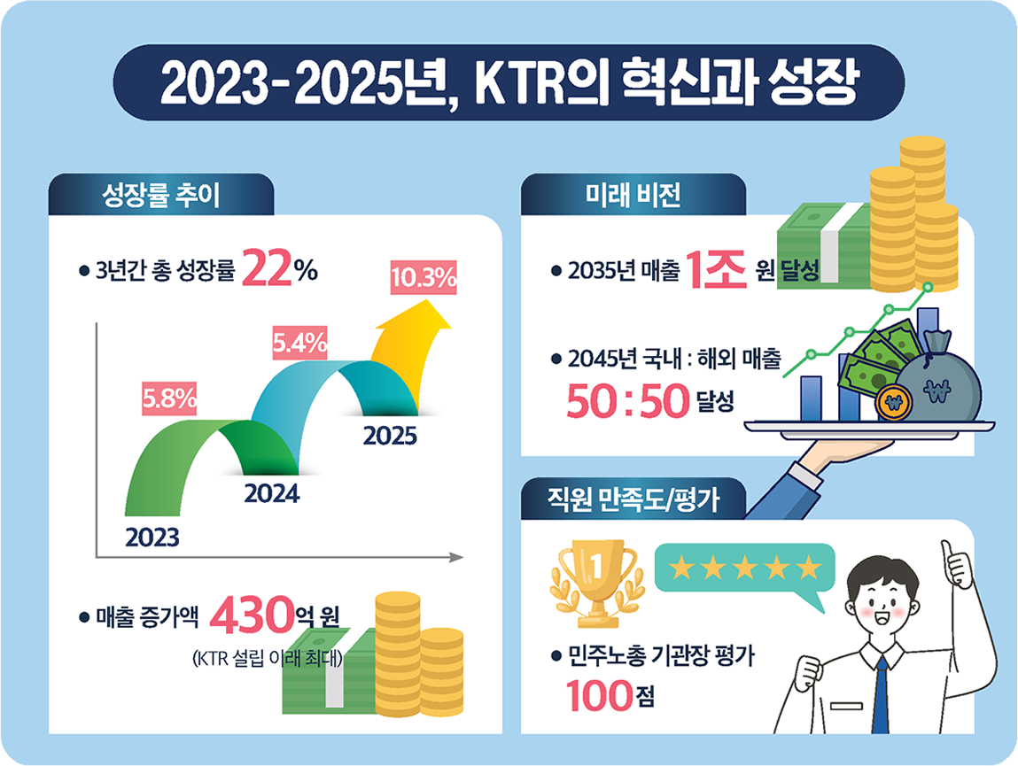 KTR은 어려운 대외 여건 속에서도 지속적인 성장을 기록했다. 2023년 5.8%, 2024년 5.4% 성장에 이어 올해 10.3% 성장이 예상되며, 지난 2022년보다 2025년에 총 22% 규모의 성장률을 달성했다. 매출액은 2022년보다 2025년 430억 원 증가해 KTR 설립 이래 최대 증가액을 기록했다.