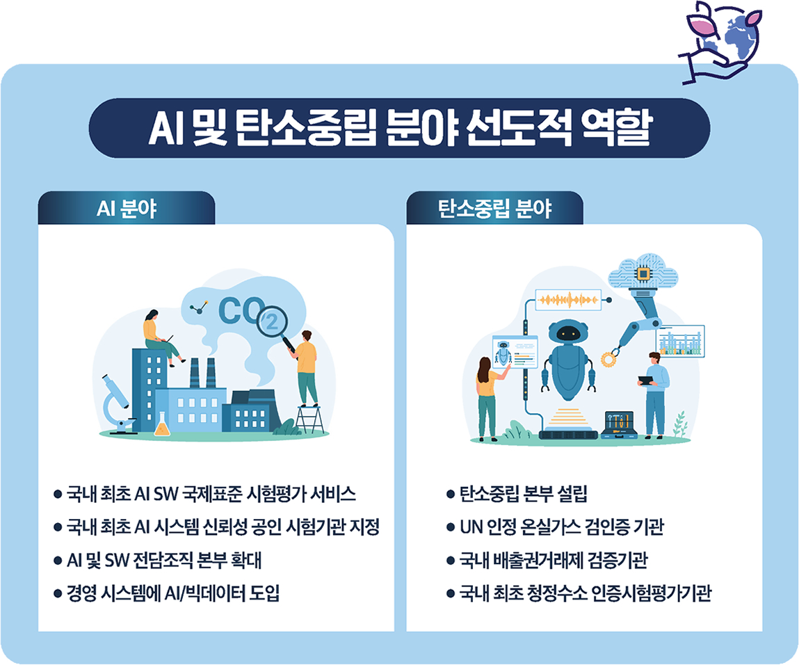 KTR은 AI, 탄소중립 등 미래 핵심 산업 분야에서 다양한 성과를 내고 있다. KTR의 AI 분야는 독보적인 퍼스트 무버로서의 입지를 다지고 있다. 2023년 10월 국내 시험인증 기관 최초로 AI 소프트웨어 국제표준을 적용한 시험평가 서비스를 시작했으며, 작년 6월에는 AI 신뢰성 국제표준 분야 공인 시험기관 지정을 받아 AI 시스템 신뢰성 공인 시험 서비스를 국내 최초로 수행하고 있다. 2023년 판교 테크노밸리에 AI 및 소프트웨어 전담 조직을 신설했고, 올해 이를 본부 조직으로 확대하는 등 전문성을 강화하고 있다. 또한, 연구원 경영 시스템에 인공지능과 빅데이터 기술을 도입하며 자체적인 혁신을 꾀하고 있다.