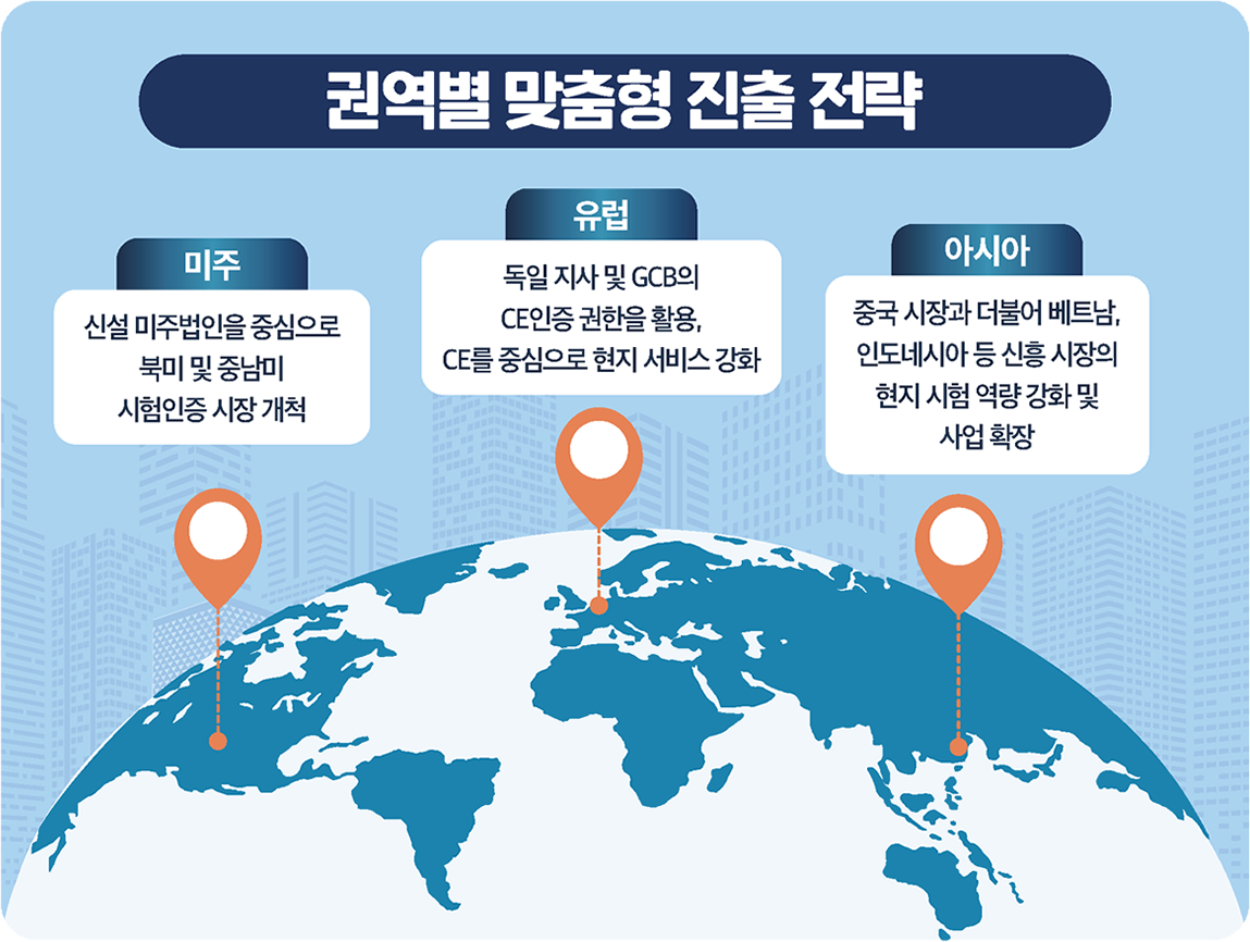 KTR은 국내 최고의 시험인증 서비스 기관을 넘어, 더욱 차별화된 글로벌 서비스를 제공하는 것을 목표로 한다. 전 세계를 미주, 아시아, 유럽 세 권역으로 나누어 권역별 맞춤형 진출 전략을 추진 중이다. 유럽 권역에서는 독일 지사와 GCB의 CE 인증 권한을 활용하여 현지 서비스를 제공하고, 아시아 권역에서는 기존 중국 시장 외에 베트남, 인도네시아 등 신흥 시장의 현지 시험 역량 강화를 통해 사업을 확장하고 있다. 신설된 미주법인을 통해서는 북미 및 중남미 시험인증 시장 개척에 적극 나서고 있다.