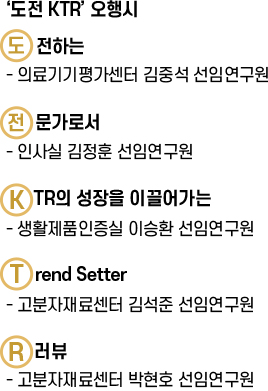 KTR의 연구원들은 큰 바다를 향해 항해하고 있다. 새로운 지식과 기술을 발견해, 행복하고 풍요로운 세상을 만들 수 있었던 것은 모두 KTR 연구원들의 도전이 있었기에 가능했다. 함께 문제를 해결했고, 세상을 더 나은 방향으로 이끌었다. 자긍심과 사명감으로 포기하지 않았다. 다섯 명의 연구원들은 ‘도전 KTR’의 성취와 미래를 위해 입을 모아 파이팅을 외쳤다.